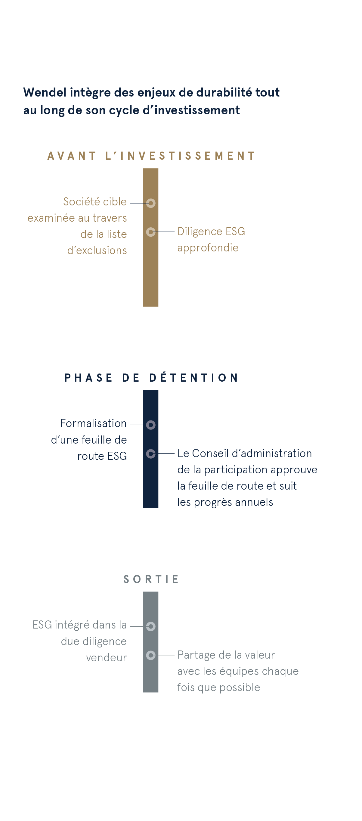 Pendant la période de détention : nous nous engageons à ce que nos sociétés aient une feuille de route ESG dans les 18 mois qui suivent leur acquisition. Ces roadmaps sont construites sur la base des principales conclusions de la diligence et doivent intégrer les quatre priorités ESG définies par Wendel : changement climatique, parité et diversité, santé et sécurité, produits et services durables et/ou écoconçus ;